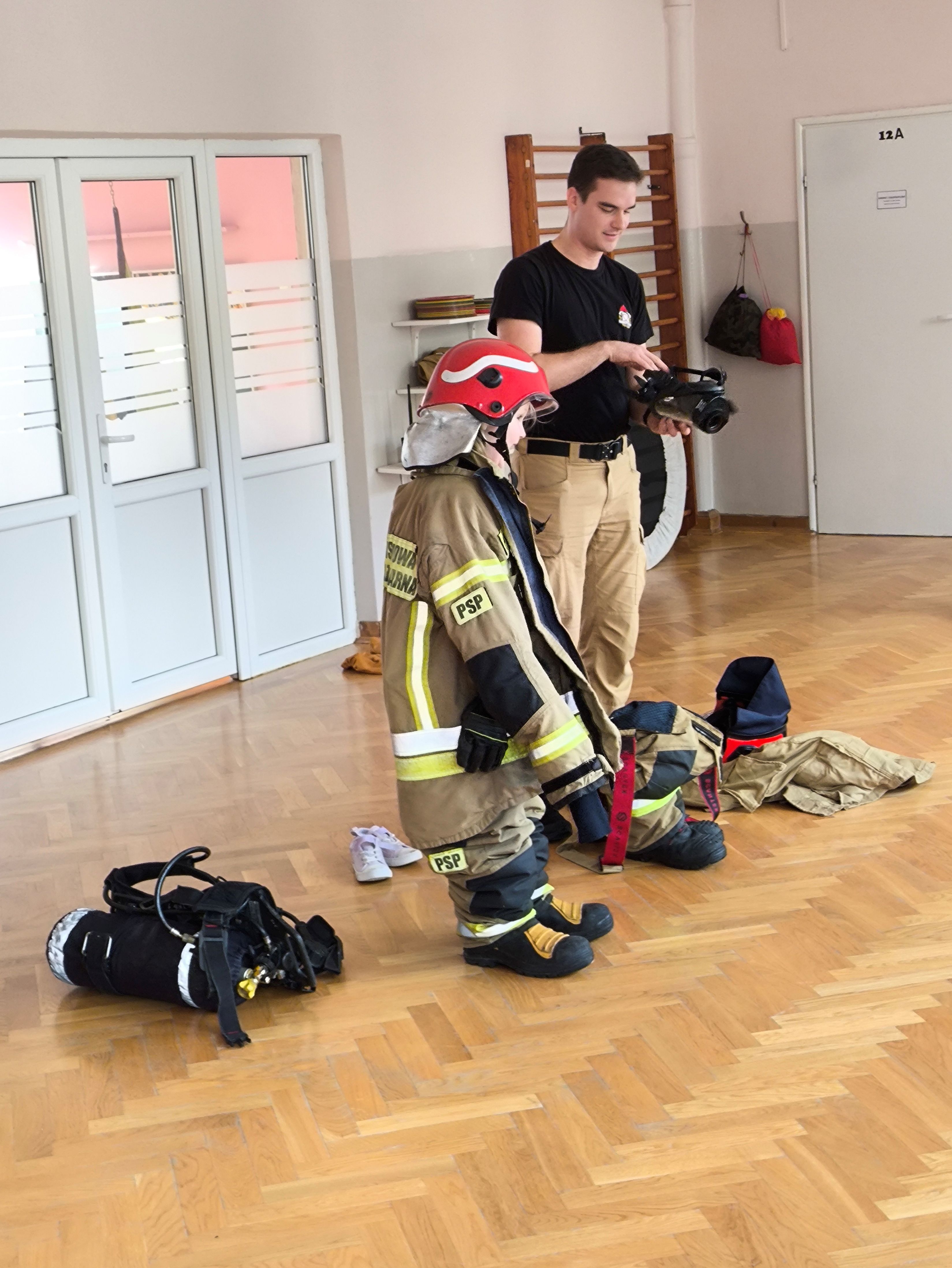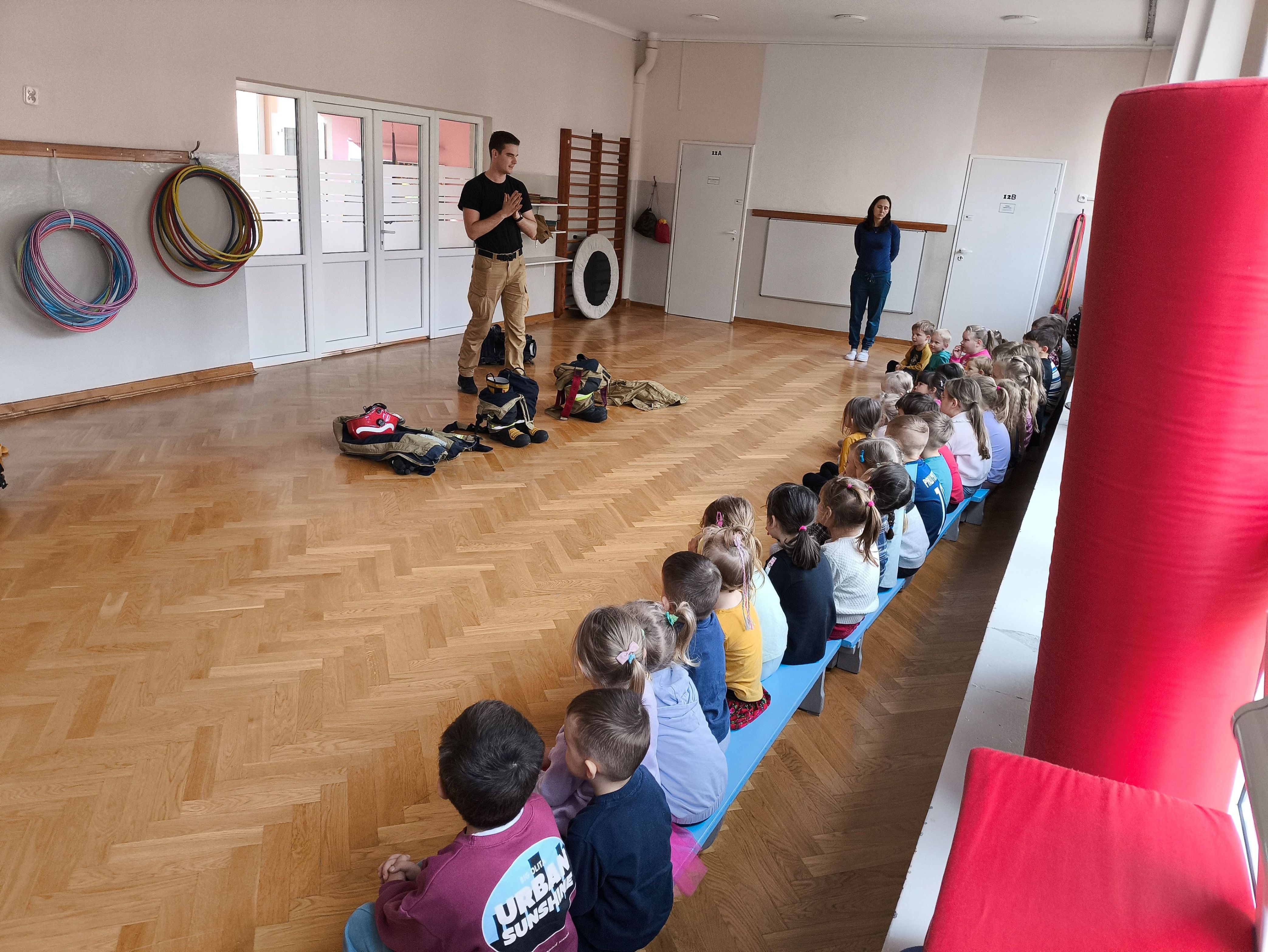 W dniu 27 listopada 2025 r. przedszkolaki uczestniczyły na terenie przedszkola w spotkaniu ze strażakami. Podczas spotkania poznali specyfikę pracy strażaków, umundurowanie strażackie oraz niektóre sprzęty jakimi dysponują. Podczas spotkania dzieci miały możliwość przymierzenia stroju strażaka. Wielką radość sprawiło dzieciom obejrzenie z bliska wozu strażackiego oraz zapoznania się z jego wyposażeniem.